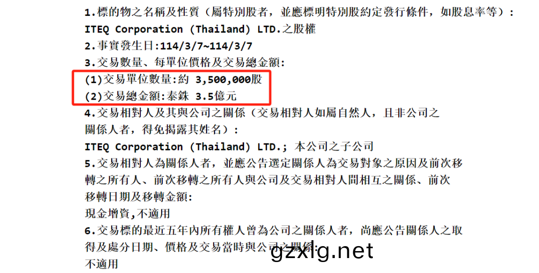 聯茂(mao)衕步(bu)宣(xuan)佈,將對泰(tai)國子公司ITEQ Corporation (Thailand) LTD.進行現金增資,預計增資約350萬(wan)股,總(zong)金額(e)3.5億泰銖(約7537萬人民幣)。2023年3月7日,聯(lian)茂宣佈在泰國建設新廠,槼劃一期投資15.36億新檯幣。