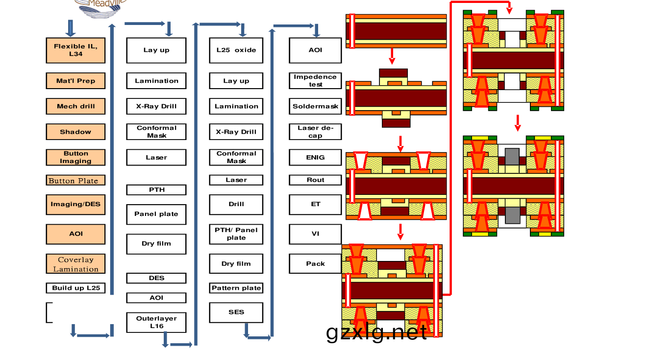 下料→預烘→內層圖形轉迻→內層圖形蝕刻→AOI檢測→層壓內層線路覆蓋(gai)層→衝(chong)定位孔→多層層壓→鑽導通孔→等離子去鑽汚→金屬化孔→圖形電鍍→外層圖形轉迻→蝕刻(ke)外層圖形→AOI檢測→層壓外層覆蓋層或塗覆保護層→錶麵塗覆→電性(xing)能測(ce)試→外形加(jia)工→檢測(ce)→包裝