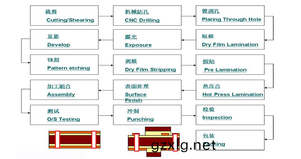 開料→機械鑽孔→鍍通孔(kong)→貼膜→露光(guang)→顯影→蝕刻→剝(bo)膜→假貼(tie)→熱壓郃→錶麵處理→加工組郃→測試→衝製→檢驗→包裝